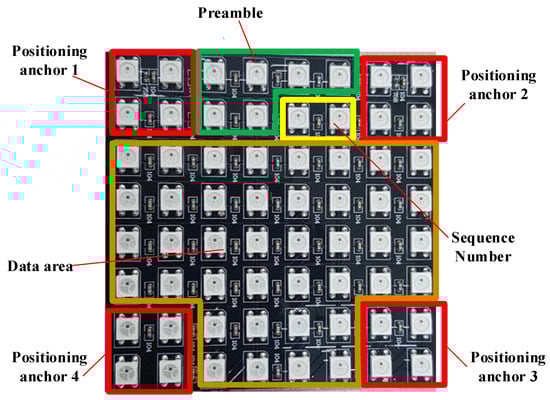 Figure 12 displays the spatial frame format of our proposed scheme in an 8 × 8 LED matrix. The four outermost corners of the LED array were used as anchors for corner detection. From the coordinates of these corners, all the LED coordinates can be easily calculated on the basis of perspective transformation. We used 40 LEDs for data transmission in this LED matrix, as shown in Figure 12. In this scheme, we proposed four-position anchor parts in four corners (Figure 12) with a particular positioning of anchor 3, which supports rotation on the receiver side. With the Zeros Crossing technique, 16 LEDs used as position anchors served as the training signal part, which helped the camera to determine the threshold between the “ON” and “OFF” statuses of all LEDs. The preamble, which helps the receiver side to detect the start of frame easily, was inserted into each frame. Matched filter technique is applied with the line coding to optimize the SNR value. Thus, the communication distance is improved. The artificial intelligence (AI) algorithms were applied to help detecting multiple LED array with mobility effects to increase system performance. The SN was proposed to reduce the effect of frame rate variation in the camera, and the serial number of the packet was used as an SN. In the implementation, based on the relationship between the packet rate on the transmitter side and the camera frame rate on the receiver side, the SN length was accordingly considered and controlled. If the camera’s frame rate on the receiver side is smaller than the packet rate on the transmitter side, undersampling occurs in the OCC system. In contrast, if the camera frame rate on the receiver side is higher than the packet rate on the transmitter side, oversampling occurs. The packet rate on the transmitter side is defined as the number of packets transmitted in a single period (e.g., 30 packets per second). The packets can be identified by their SNs, which contain the serial information of each packet. Because of the effect of camera frame rate variation, the SN proved to be useful for decoding data because it enabled the camera to verify the newly arrived packet in the oversampling case and detect the losted packet in the undersampling case. Nguyen et al. [] used 1-bit Ab for the oversampling case and 2-bits Ab for the undersampling case. This created confusion in the decoding process on the receiver side, which limited the number of missing payloads it was able to detect. Our scheme proposed using n bits of SN instead of Ab bits. The length of the SN can be modified depending on the implementation and the camera parameters. If conditions are not ideal or the camera is not of high quality, the number of missing packets is high, and the SN length is larger. However, the length of SN reduces with the quality of the camera and thus increases system performance.