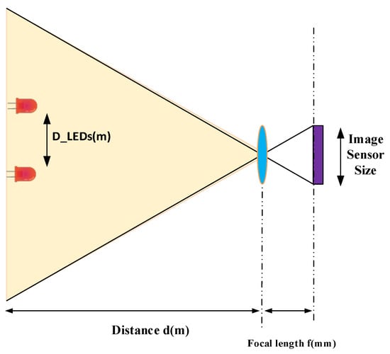 where the focal length of the camera and the work distance is represented by f and d, respectively. D_LEDs is the distance between two LEDs in a realistic experiment, and d_LEDs is the distance between two LEDs in the image. Equation (7) can be used to calculate the minimum distance between two LEDs. By applying the Nyquist theorem, RoIs can detect the minimum distance between two LEDs in two pixels. The value of the minimum distance between two LEDs is calculated as follows: