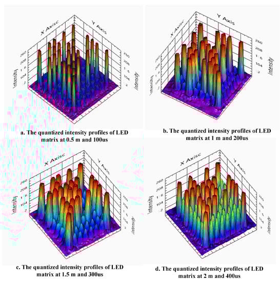 The quantized intensity profile of the LED matrix at (a) 0.5, (b) 1, (c) 1.5, and (d) 2 m with different exposure times.