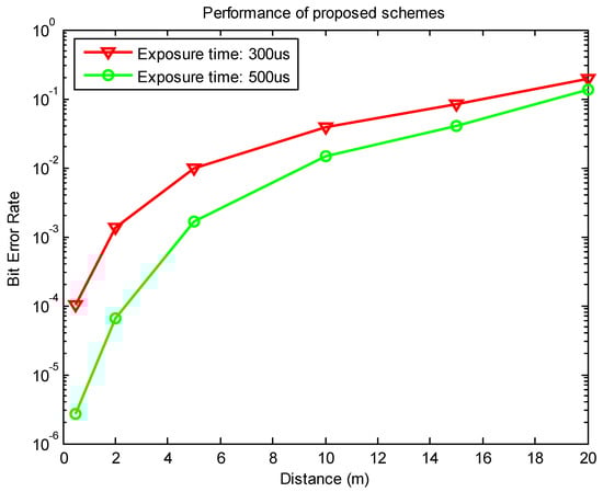 Figure 17 shows the results of using a Point Grey rolling shutter camera at different distances and exposure times. The BER is measured with varying times of exposure, with the same communication distance and noise condition. The communication bandwidth has a vital relationship with the exposure time; thus, both exposure time and the trade-off between exposure time and signal noise must be considered. To reduce the bit error rate or increase the communication distance and thus increase system performance, channel coding should be used. However, to calculate the working communication distance, Equations (7) and (8) should be used. The parameters of the proposed scheme are presented in Table 1. The summary of the comparison of MIMO-OCC methods will be presented in Table 2 to highlight the proposed scheme. We implement this scheme with 8 × 8 LED matrix at the communication distance of 2 m, which can be visually assessed by the Supplementary Materials.
