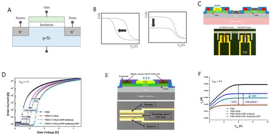 (A) Field-effect transistor (FET) structure. (B) Example of detection using change in threshold voltage at drain and current change at drain. (C) FET-based sensor system composed of heterogeneous AlGaN/GaN layers. (D) The state of the gate viewed through the change in the threshold voltage at the drain. (E) Another FET-based sensor system composed of heterogeneous AlGaN/GaN layers. (F) Gate state observed through current change in drain (Reproduced with permission from [,], published by Elsevier 2016, the figure follows the term of use under a Creative Commons Attributions License).