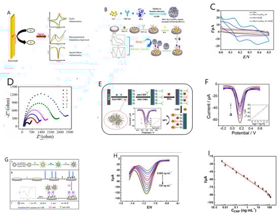 (A) Electrochemical sensor basic structure. (B) Illustration of the synthesis procedure of BSA-Ab2-Cu3(PO4)2 hybrid nanoflowers as signal labels, fabrication process of the electrochemical immunosensor. (C) Cyclic voltammetry (CV) of polydopamine nanospheres (PDANS) modified electrode (black line), BSA-Ab2-Cu3(PO4)2 nanoflowers on the modified electrode (red line), and sodium molybdate reaction with (green line), without BSA-Ab2-Cu3(PO4)2 nanoflowers on the modified electrode (blue line). (D) Electrochemical Impedance Spectrum (EIS) responses recorded at different modified electrodes in 5.0 mM [Fe(CN)6]3−/4− and 0.1 M KCl. From curve a to curve f: bare GCE; PDANS/GCE; Ab1/PDA NS/GCE; BSA/Ab1/PDANS/GCE; CRP/BSA/Ab1/PDANS/GCE; BSA-Ab2-Cu3(PO4)2/CRP/BSA/Ab1/PDANS/GCE, respectively. (E) Schematic diagram of the processes to prepare C-reactive protein (CRP) immunosensor. (F) Differential Pulse Voltammetry (DPV) responses of BSA/anti-CRP/ZnO/MPC/IL-CPE to different CRP concentration (0.01, 0.1, 1, 10, 50, 100, 300, 500, 1000 ng·mL−1). Inset: linear relationship of current (Ip) vs. logarithm (logc). (G) Schematic diagram of the processes to prepare CRP aptasensor. (H) Square Wave Voltammetry (SWV) recorded of the aptasensor at different concentrations of CRP (0.005, 0.01, 0.05, 0.1, 0.5, 1.0, 5.0, 10.0, 25.0, 50.0, 75.0, 100.0, 125.0 ng mL−1) in 0.2 M HAc-NaAc (pH 5.5). (I) Calibration curve of the peak current vs the logarithmic concentration of CRP. (Reproduced with permission from [,,] published by Elsevier 2019, 2017).
