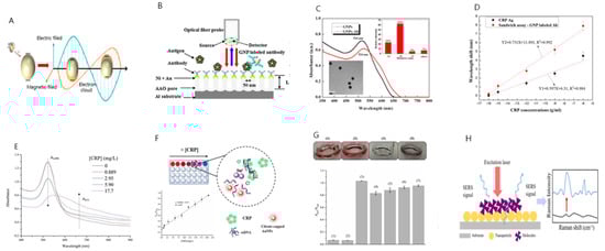 Moreover, the SERS platform using porous magnetic Ni@C nanospheres and CaCO3 microcapsules has been established []. The SPR biosensing techniques for CRP detection, which showed the probe and LOD, are presented in Table 3.