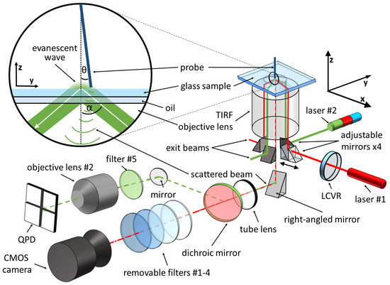 The small size of LMFM cantilevers [35], and their vertical orientation, makes it difficult to use conventional AFM optical detection systems [18,19], so LMFM detects the probe’s tip position using the Scattered Evanescent Wave (SEW) detection system [29]. The SEW detection is based on the fact that objects entering the evanescent field scatter the light, transforming it from near-field to far-field. The scatterer’s three-dimensional position is subsequently measured using a four-sector photodetector. The SEW system has been successfully tested in ambient and liquid environments [35]. The evanescent wave is created upon total internal reflection of a laser beam at the glass-air (or glass-water) interface. The LMFM setup described in Figure 1 makes use of two fibre-coupled lasers; laser #1 is a OBIS FP 660LX (Coherent, Inc., Santa Clara, CA, USA) and laser #2 is a Stradus VersaLase (Vortran Laser Technology, Roseville, CA, USA) with multiple wavelengths (488 nm, 561 nm, 642 nm). The two perpendicular laser beams produce two concentric evanescent fields with perpendicular wave vectors. The SEW detection system uses one wavelength (642 nm-laser #2), while the other laser lines can be used to study optical forces in evanescent fields [31] or combine SPM with Total Internal Reflection Fluorescence (TIRF) microscopy. Two adjustable mirrors are located underneath the TIRF objective lens (Nikon, 100x TIRF objective ) and direct the laser beams into the lens. Changing their position affects how far from the axis of the objective lens the beam propagates, which, in turn, affects the angle () of incidence of the beam onto the glass surface. Two further mirrors are positioned underneath the objective to stop the exit beams from reaching the detectors. When the tip of the probe scatters the evanescent field, the TIRF objective lens collects the light and produces a high-magnification image in the detection plane. Before reaching the four-sectors photodiode (Hamamatsu S5990-01), the scattered light goes through a dichroic mirror which separates the detection wavelength from the other wavelengths. A second objective lens (Olympus, Plan Fluorite Oil Immersion Objective ) is positioned directly in front of the photodetector for further angular magnification. An sCMOS camera (Hamamatsu Orca Flash 4.0) is used for conventional evanescence light scattering microscopy or TIRF microscopy. An automatic routine uses the vertical probe image from the camera with the signal from the photodiode to position the cantilever on the optical axis of the TIRF lens. This operation uses the motorised stages described in the following section.