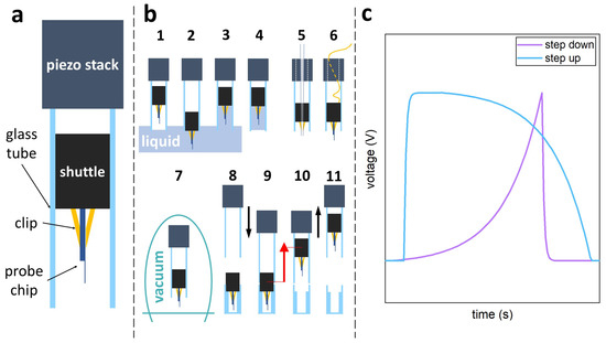(a) Schematic drawing of the Vertical Positioning System (side view) (b) schematic drawings of different applications of the VPS. (1–4) The VPS has been tested in liquid environment, and the glass tube can act as a functionalisation chamber. (5) The VPS can be used for other SPM techniques, e.g., NSOM, which uses tapered waveguide probes or (6) STM by establishing an electrical connection to the conductive probe. (7) The VPS has been tested and is compatible with working in a vacuum of mbar. (8–11) The VPS can expel and regain the plug under simple stick-slip operations. This simple probe exchange can be automated. (c) Asymmetric sawtooth waveforms with exponential deceleration used to drive the VPS.