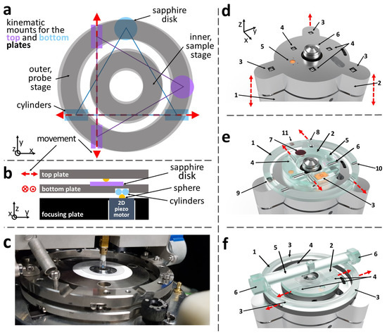 (a,b) Top view of the probe and sample HPS and kinematic mount details. Only the outer ring is described. Two sets of three ball bearings are positioned at the vertices of two orthogonal equilateral triangles. The first set is fixed on the piezo motors, while the second set is mounted on the top plate’s lower part. The bottom plate can only move in the x-direction under stick-slip action, while the top plate’s movement is confined to the y-axis. (c) Photograph of the current implementation of the HPS and the VPS. (d–f) CAD drawings, including the microscope’s focusing plate and the sample and probe HPSs. (d) (1) Microscope’s base where the objective lens (6) is mounted. (2) Focusing plate which can move in z-direction using three DC-motors (not shown). The two sets of three XY piezo motors, (3) and (4), are mounted on the focusing plate (2). (5) Otical encoder that measures the movement in the x-direction of the sample stage. (e) HPSs’ bottom plates for the probe (1) and sample (2). The two pairs of lower cylinders (8) and sapphire disk (9) ensure ring (1) can only move in the x-direction. Similarly, ring (2) can only move in the x-direction thanks to the pairs of lower cylinders (4) and sapphire disk (5). The same type of kinematic mount is present on the two rings’ top surface to ensure both top plates can only move in the y-direction (cylinders (6) and (10) and sapphire disks (9) and (7), respectively). The optical encoder (3) measures the movement of the top sample plate in the y-direction. (f) Top probe’s (1) and sample’s plate (2). The mechanical coupling between the top and bottom plates is ensured by two sets of three ball bearings (3) and (4) mounted on the lower surface of the probe and sample plate, respectively. The Vertical Positioning System is partially visible at the centre of the bridge (5). The tilt of the VPS is controlled by rotating the two stepper motors (6).