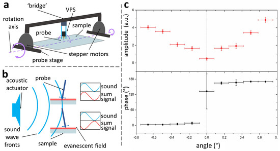 To obtain consistent results in LMFM, it is essential to determine the cantilever’s vertical tilt within a fraction of a degree. An acoustic actuator is used to oscillate the cantilever out of resonance as this ensures stable phase measurements. When the cantilever is not vertical, this oscillation causes the tip to move laterally and up and down with respect to the surface. The vertical oscillation can be observed as a modulation in the sum signal detected using the SEW method (see Figure 4b,c). A lock-in amplifier can measure this oscillation amplitude and its relative phase. A large cantilever tilt angle corresponds to a large oscillation of the sum signal. The cantilever tilt is adjusted by minimising the amplitude measured by the lock-in amplifier. As illustrated in Figure 4b, when the probe is tilted in one direction, the sum signal has a specific phase relation with the acoustic signal. If the tilt direction changes, the phase shifts by approximately . The vertical position of the cantilever can be estimated within using an automatic routine that finds the minimum amplitude with an associated sudden change in the phase signal (see Figure 4c).