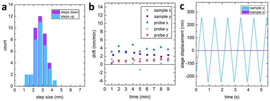 (a) Histogram of the average step size of the VPS in both upwards and downwards directions. (b) Measurements of the sample and probe’s drift in the xy-plane and of the probe’s drift in the vertical direction. (c) The cross-talk between displacements in orthogonal directions of the sample’s HPS is around .
