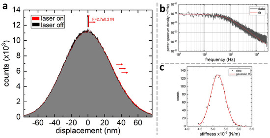Force measurement with sub-fN precision. (a) A shift in the positive direction of the position distribution upon laser illumination (red) is visible to the right of the grey area which corresponds to the overlap of the two distributions. (b) A PSD of the probe’s position used to evaluate the probe’s stiffness. (c) A distribution of stiffness values for the cantilever used to calculate the force in (a).