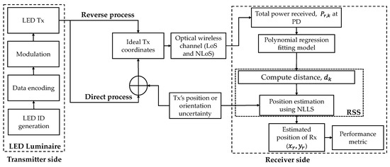 The block diagram of the proposed VLP system is shown in Figure 3. In the case of LOS, the horizontal distance can be computed as and therefore can be determined from (2) as given by: