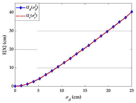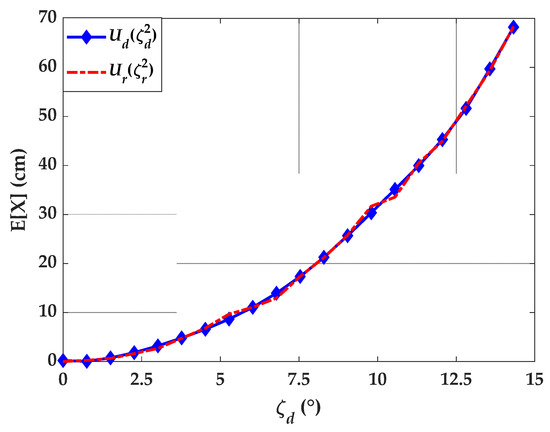 where and are the equivalent position perturbations, which are functions of the random orientation angles , , and . Equating and , allows to retrieve the correction values for the angle uncertainty, as a function of . To show that the processes are indeed equivalent, we performed the simulation for , the results are depicted in Figure 7. As it can be seen the two expectations match well and reveal that the effect of orientation uncertainty is worse than the position uncertainty.