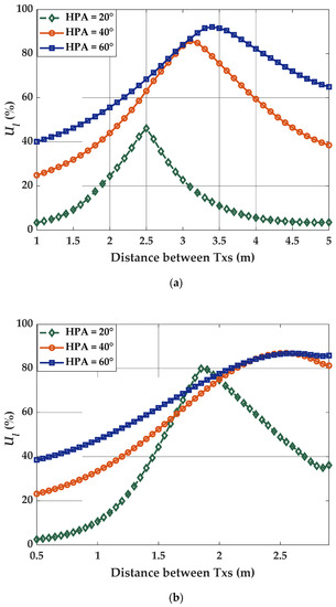 Lighting uniformity relies on the three factors related to the Txs, i.e., the distance between the Txs, HPA, and the number of Txs. Figure 8 illustrates the lighting uniformity as a function of the number of Txs (i.e., 4 and 9) and for different values of HPA.
