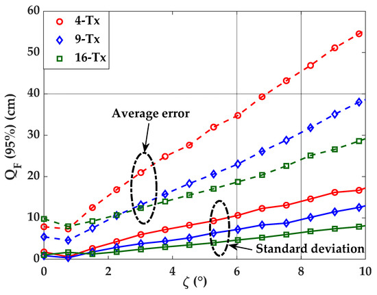Figure 11 depicts the average and standard deviation of the 95% quantile of εp or as a function of for 4-, 9-, and 16-Tx for the Tx’s orientation uncertainty. It is clear from the figure that, alike the case of Tx’s position uncertainty, the effect has more significant error dependence for set-ups with a lower number of Txs. It is observed that for of 5°, the average positioning errors are 31.9, 20.6, and 17 cm, with the standard deviation values of 9.2, 6.3, and 3.9 cm for 4-, 9-, and 16-Tx cases, respectively. The increasing error also proves an increasing trend with , therefore, the placement of Tx with the accurate Tx’s position and its orientation should be taken into consideration, as the error may rise even with low values of set-up uncertainties.