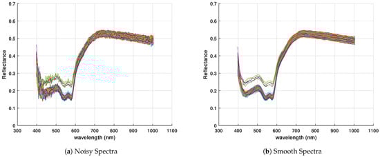 Based on visual inspection, the Savitzky Golay smoothing filter performed well for noise removal. To deal with pixel information in an HSI cube, a derivative is a helpful technique to detect pixel variations, subtle characteristics, and weak absorption bands. First-order derivatives can be used to remove spectral shifts. However, in this work, higher-order derivatives are used to extract overlapping spectral features and for background elimination [