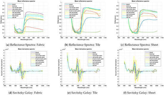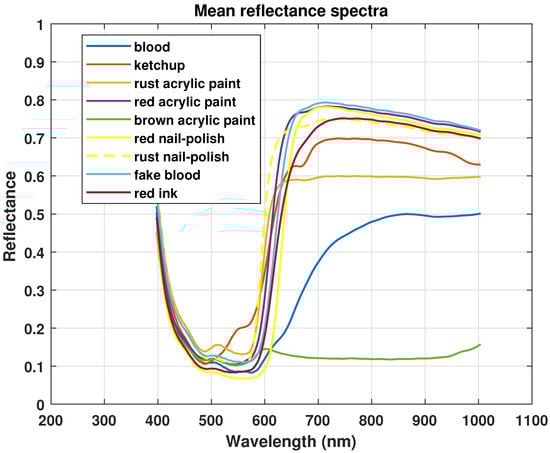 47]. The spectral properties of hemoglobin derivatives are used in this study to develop identification criteria. The mean reflectance spectra and their derivatives of blood samples are observed against different red-colored substances that could be confused with blood. In the visible region, two peaks