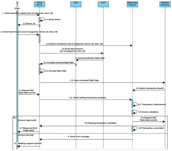 - Data origin authentication: All nodes in blockchain are capable of verifying the authenticity of the data transmitted, with the help of digital signature cryptography. Thus, data authentication between UAVs, GCS, and users is guaranteed.
