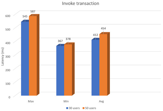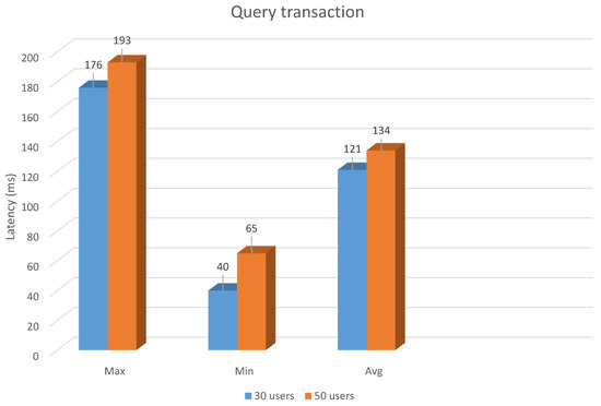The latency of executing a query function for these groups is shown in Figure 5. The average latency of executing query transactions for two groups of 30 users and 50 users is 121 and 134, respectively. The minimum latency for the 30-user group and the 50-user group is 49 and 65 while the maximum latency for the 30-user group and the 50-user group is 176 and 193, respectively.