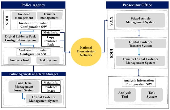 Studies on ways of improving the original identity, integrity, and reliability of criminal digital evidence obtained in the investigation process in Korea have been conducted [4,5]. However, most of these studies focus on identifying the characteristics of digital data, and establishing a life-cycle-based management environment with integrated digital evidence management. Figure 1 shows one proposed integrated digital crime management system in Korea. Its aim was to integrate digital evidence and investigation information through the national transmission network by linking KICS—a criminal justice information system operated by the police, prosecutors, and courts—and the case management systems of the national police agency [4].