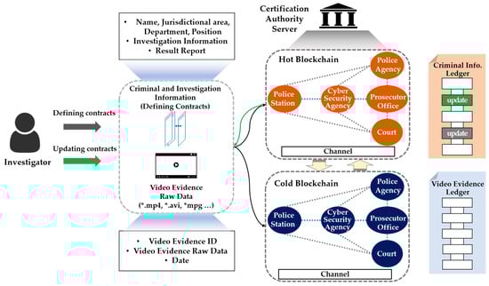Our proposed two-level blockchain system for efficient crime evidence management consists of two layers, managed by hot and cold blockchains (Figure 3). In the hot blockchain, investigation and identity information with frequent transaction fluctuations throughout the criminal investigation process is stored, and the cold blockchain stores digital crime evidence videos that do not require modification after storage.