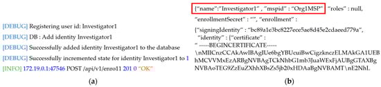 In the system proposed in this paper, we use Hyperledger Fabric, a blockchain construction framework, and Docker, a software virtualization framework, to implement the two-level blockchain. When managing a blockchain, a number of nodes are connected within the communication network in order to exchange data, so physical computers for each configured peer are required. To do this, a number of peers, authentication servers, orderers, and blockchain state databases are created as containers using Docker, and the blockchain infrastructure is maintained by mounting ledgers, blocks, transactions, and other components to the built container. In the two-level blockchain system, PKI-based encryption keys are issued and used as credentials, so that peers corresponding to the local police agency, cyber analysis team, prosecutor’s office, police agency, and courts can form a consortium and participate in the same channel. To enable the on-site investigator to store investigation and identity information and digital crime evidence videos in the hot and cold blockchains in the two-level blockchain system, the identity is registered in containerized peers and orderers. To this end, containerized peers participate in the channel to form a consortium, and an identity registration request is made to the authentication server using a PKI-based administrator digital certificate and private key. Figure 4 shows the result of requesting the authentication server to register an identity for each affiliated organization, and obtaining access to the two-level blockchain system in order to register the user identity to the peer of the hot and cold blockchain. We can confirm that the identities of the peers have been registered. Based on the registered identity shown in Figure 4, the authentication server issues the digital certificate and private key for each institution, and these are used for identity verification when accessing the hot and cold blockchains.