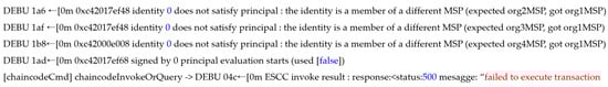 The cold blockchain, which is a core part of the system proposed in this paper, is accessed using the same digital certificate and key used when requesting identity registration for the hot blockchain. Subsequently, the on-site investigator stores the crime evidence video by passing the digital crime evidence video and part of the identity information stored in the hot blockchain as chaincode factors of the cold blockchain. In the chaincode of the cold blockchain, the crime evidence video delivered by the on-site investigator is sequentially delivered, and the chaincode is executed. When investigation and identity information, along with crime evidence video transactions, are shared with all of the peers in the two-level blockchain, all of the nodes of each blockchain reach consensus to create a block. At this time, all peers participating in the channel share the same transaction and block. In contrast, if the two-level blockchain is accessed using an unregistered identity, the two-level blockchain system cannot verify the identifier, and the chaincode cannot be modified, as shown in Figure 6. Therefore, the records stored in each ledger cannot be changed, and blocks cannot be created.