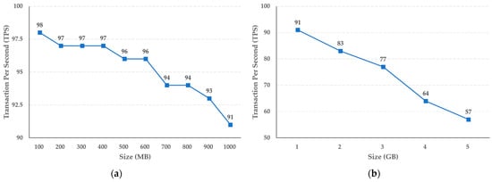 The experimental results shown in Figure 7 reveal that the storage function of the cold blockchain decreases by an average of 0.11 TPS when the capacity increases in steps of 100 MB, from 100 MB to 1 GB, while when the capacity increases in steps of 1 GB, the average decrease in TPS is 0.7. In addition, as shown in Figure 8, the query function performance of the cold blockchain decreased by an average of 1.4 TPS when the capacity increased from 100 MB to 1 GB in steps of 100 MB, and by an average of 6.8 TPS when increased in steps of 1 GB. This reflects the difference in the increase in capacity of 100 MB and 1 GB, and confirms that the difference in TPS as the actual uniform capacity increases can be predicted for the target capacity.