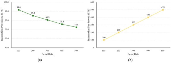 The TPS is the number of transactions that can be processed in one second, and is a representative blockchain performance evaluation index that indicates how many contracts the corresponding blockchain system can process. The transaction processing delay time refers to the delay until a transaction is received and the chaincode is executed. This is used to measure the number of transactions processed per second. Transaction throughput per second calculates the number of transactions processed per second using the first transaction submission time and the last transaction submission time, which is the transaction time, the number of successful and unsuccessful submissions, and the transaction processing delay time.