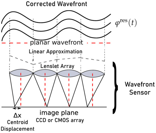 A wavefront sensor (Figure 2) is an optical device that is used to measure the aberrations of an image. It consists of an array of lenses (lenslets) focused on an CCD or CMOS array (image plane). The basic idea is to measure the displacement of the centroid with respect to the ideal wavefront (planar wavefront) centroid position. Afterwards, using this information we can obtain a reconstructed wavefront (a linear approximation). Because only tilts are measured, the Shack–Hartmann wavefront sensor is not capable of detecting discontinuous steps in the wavefront. The CCD o CMOS detector requires a period of time (integration time) to accumulate enough photons to sample the wavefront and obtain a centroid. This implies that the WFS integrates the incoming wavefront during the integration time.