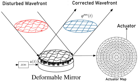 Figure 1 shows the classical model of an AO system used in astronomy. This AO closed-loop system consists of a wavefront sensor, a deformable mirror , a controller , and a zero order hold (ZOH) [6,21,22], where should be understood as the derivative operator or the argument of the Laplace transform, and z is either the forward shift operator or the argument of the Z-transform. The continuous-time signals , and are the total disturbance (the amplitude of the disturbed wavefront; turbulence+vibrations), the correction disturbance (that corrects the wavefront), and the residual disturbance, respectively. The disturbed wavefront is defined as the sum of the atmospheric turbulence effect and the different vibration sources effect , [5,6,22]. That is: