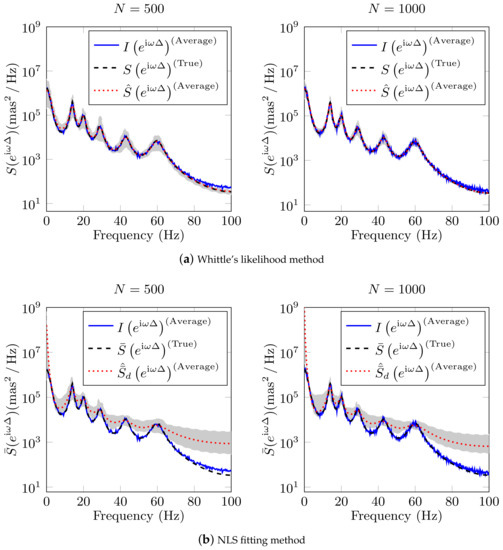 Figure 9 shows the estimation results from the MC simulations of the system with six oscillators for a) Whittle’s likelihood method and b) NLS fitting method. Each identification approach yields a different . In this Figure, the solid blue line represents the average of all the periodograms, the dashed black line represents the true discrete-time PSD, the dotted red line represents the average of all the estimated discrete-time PSDs, and the gray shaded region represents the area in which all of the estimated spectra lie. Despite that Whittle’s likelihood is an asymptotic approximation to the traditional likelihood function, in Figure 9 we can observe that the estimation with this approach exhibits good accuracy for small data length, namely . Moreover, we observe that, the greater the N, the smaller the gray-shaded region. In contrast, the NLS fitting method does not exhibit an accurate estimation.