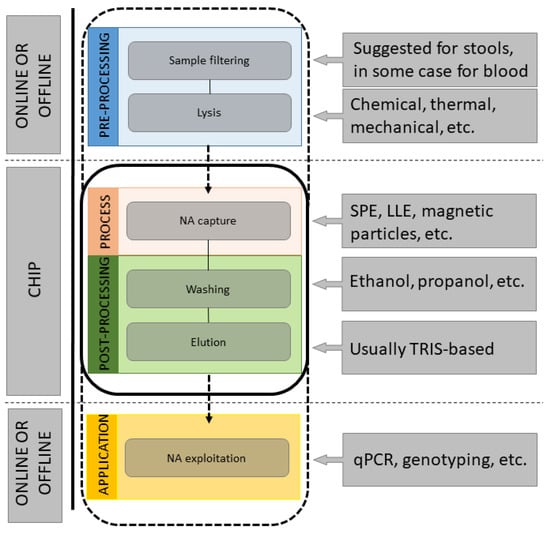Theoretical scheme of a LOC for NA extraction from raw human samples. Raw samples are filtered, if necessary, and cells are lysed. NA are captured while other cellular components are removed. The successive step involves NA elution to obtain pure NA, which can be analyzed online or withdrawn for offline analyses.