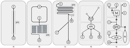Schematization of chip structures from a simpler to a more complex design. (A) Chip with a simple linear structure: the main flux circulation is driven into a single microchannel through an inlet and an outlet port. The extraction domain consists of a part of microchannel with a packed adsorbent matrix polymerized inside it [,,,,]. (B) Chip with a coil-shaped microchannel: the extraction domain is composed of a long microchannel with an increased surface/volume ratio of the adsorbent matrix packed inside it [,,,]. (C) Chip with a main microchannel and a side arm: sample and reagents are loaded in separate steps through different ports. Flux direction can be modulated at each phase by pressure application [,,,,]. (D) Chip with electrokinetic motion: sample and pre-stored reagents are driven by voltage modulation into the extraction and amplification domains []. (E) Chip with a multi-domain design: each step of the sample processing is managed by valve activation. Generally, complex chips allow a whole sample treatment, from the lysis, the NA extraction with the development of various extraction techniques and, in some cases, the sample post-processing [,,,,,,,]. I = Sample or reagents inlet; O = Sample outlet; SPE = Solid-phase extraction domain; W = Waste chamber; PCR = Amplification chamber; E = Electrodes; V = Valves; M = Mixing or lysis chamber.