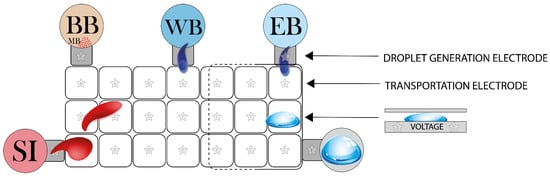 Schematization of a DMF platform. Droplets are formed from the reservoirs (e.g., SI = Sample Inlet, BB = Binding Buffer, WB = Washing Buffer, EB = Elution Buffer) by droplet generation electrodes. Each droplet is controlled in its path by voltage application on all the transportation electrodes.