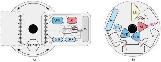 Schematization of (A) centrifugal and (B) lab-on-a-disk microfluidic systems. Both types, mostly based on a magnetic beads extraction or, less commonly, on silica filtration, are developed onto a rotating platform where sample and reagents motion is enabled by centrifugal and related forces (Coriolis and Euler) that, usually in combination with pneumatic forces, handle the fluidic system and enable sample processing. This principle is applied in traditional rectangular LOCs [,,] and in LOD systems [,,,,,]. These devices generally manage the sample by changing speed and sense of rotation: a particular example of a LOD is represented by LabDisk analyzer [,] which implements an automated lyse-bind-wash-elute protocol by means of a gas-phase transition magnetophoresis principle, which combines magnetic and centrifugal forces to carry NA-complexed magnetic beads through the separation liquid/gas interfaces between each reaction chamber. P = pressure application with pump; SI = Sample inlet chamber; SPE = Solid-phase extraction domain; MB = Magnetic beads chamber; LB = Lysis buffer reservoir; WB = Washing buffer reservoir; EB = Elution buffer reservoir; SO = Eluted sample outlet; W = Waste chamber.