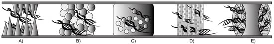 Examples of most common silica structures involved in adsorbing NA: (A) pyramidal micropillars []; (B) surfaces packed with silica microbeads [,,,,,]; (C) colloidal sol-gel solutions packed with silica microbeads [,,]; (D) silica wafer monolith [,,,] or polymer monolith with silica microbeads [,]; (E) silica membrane filters [,,,,,,].