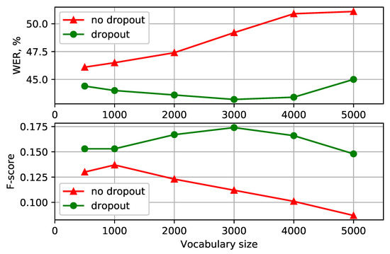 (Georgian): WER and F-score for different vocabulary size for BPE segmentation with the dropout (top) and without (bottom).