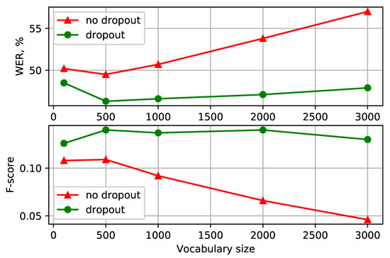 (Georgian): WER and F-score for different vocabulary sizes with () and without BPE-dropout augmentation.