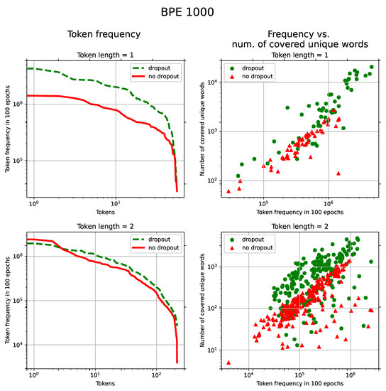 (Turkish): Left: Token frequency distribution in 100 epochs. The horizontal axis represents tokens sorted by their frequencies in the descending order. The vertical axis shows frequencies of tokens. Right: token frequency vs. number of unique words in which these tokens are present. Points represent individual tokens. Both statistics were computed on the training set for token lengths 1 and 2 with the dropout and without. The BPE vocabulary size was set to 1000.