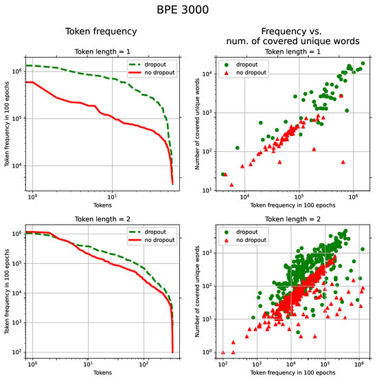 (Turkish): Left: Token frequency distribution in 100 epochs. The horizontal axis represents tokens sorted by their frequencies in the descending order. The vertical axis shows frequencies of tokens. Right: token frequency vs. number of unique words in which these tokens are present. Points represent individual tokens. Both statistics were computed on the training set for token lengths 1 and 2 with the dropout and without. The BPE vocabulary size was set to 3000.