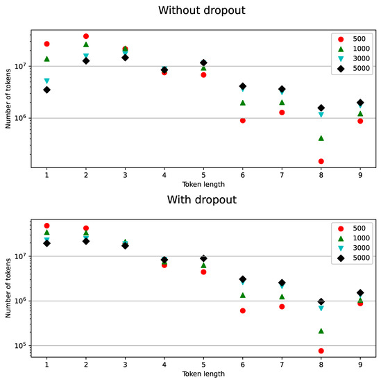 The increase in the frequency of short tokens occurs due to “forgetting” to apply some merging rules when assembling short tokens into more complex ones. Without “forgetting,” these short non-terminal tokens become a part of other tokens, which causes the appearance of non-terminal tokens in words that are otherwise occupied by more advanced terminal subwords. Thus, the model receives more diverse contexts for these tokens during the training process. It can be seen in Figure 4 and Figure 5 that, with BPE-dropout, short tokens appear evenly more often during the training (left line charts) and in a broader set of unique words (right scatter charts). The latter is also true for longer tokens (3–4 characters long).