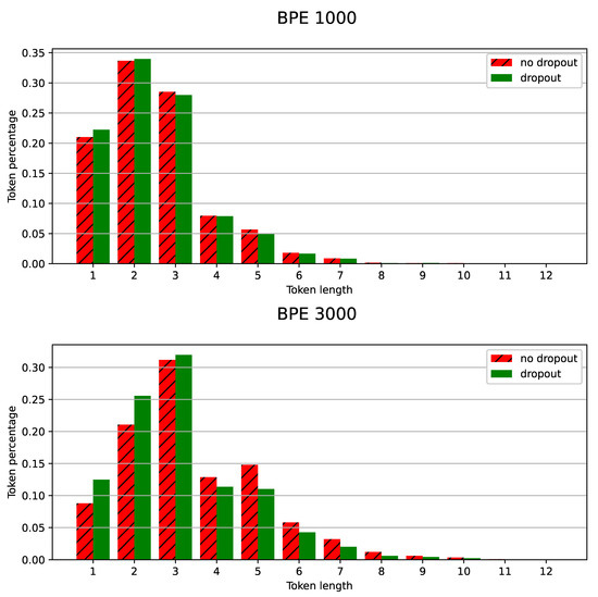 By revisiting Figure 2 and Figure 3, it can be seen that the larger the vocabulary size, the more noticeable the improvement from using BPE-dropout augmentation. To explain this, we compared actual token distributions in the recognition results obtained. As demonstrated in Figure 7, BPE-dropout increases the number of relatively short (1–3 characters long) tokens in the OOV words from 61% to 75% for the BPE vocabulary size 3000. However, in the case of the vocabulary size 1000, token length distributions in OOV are almost identical. This may mean that the greater the improvement from the use of BPE-dropout, the more it reshapes and shifts the model token distribution towards the shorter ones, assuming that the dropout parameter remains the same.