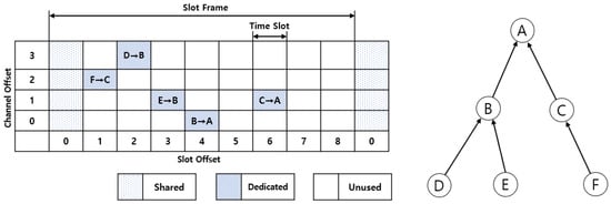 In Figure 2, six nodes(Node A-F) form a TSCH network to exchange data. Packets are sent and received by repeating Tx, Rx, and Sleep in a single cell divided into slot offset and channel offset. In a shared cell, control messages to help form or maintain a network are exchanged. Typical examples are enhanced beacon (EB) [16] for configuring a network or DIO for forming a network topology. Packets contained data can be sent and received in a fixed cell. The scheduling scheme that determines when each node sends and receives packets (in what time slot) and which channel is used is not covered by the IEEE 802.15.4e TSCH standard and varies depending on the specific application. The length of one cell in the TSCH standard is 10 ms, which is the time required to transmit a frame and receive the received ACK. In an unused cell, no packet transmission is performed by any node, and each node maintains a sleep state.