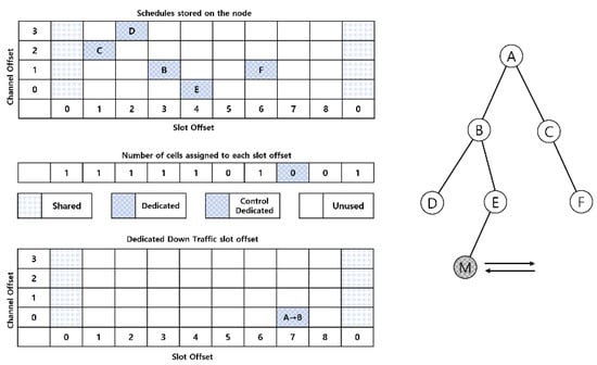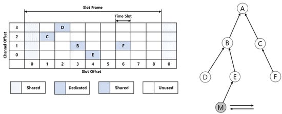 The root node stores shared and automatic cells, as shown in Figure 3. In Figure 3, a shared cell is a dedicated cell that can send/receive EB, DAO, or DIO control messages, and the alphabet of the automatic cell represents a node participating in the network that is stored in the root node. An automatic cell is a value stored by the root node to allocate the Tx cells of a moving node in a fixed path to the root node, and no communication occurs in that cell.