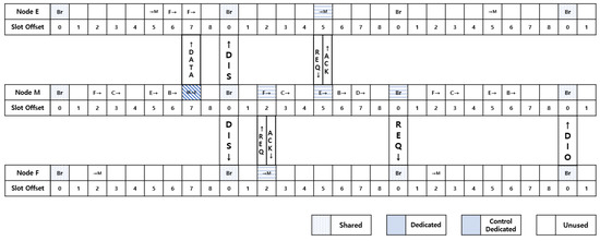 Figure 5 shows a simplified schedule of mobile nodes in the network shown in Figure 6. The topology shown in Figure 6 is a situation in which the movement of a mobile node releases a link assignment with node E and changes to a preferred parent node with node F. For example, in the first slot frame, in slot frame 7 of mobile node M, there are Rx cells dedicated to control with node D and Tx cells dedicated to data with node E that send and receive data packets.