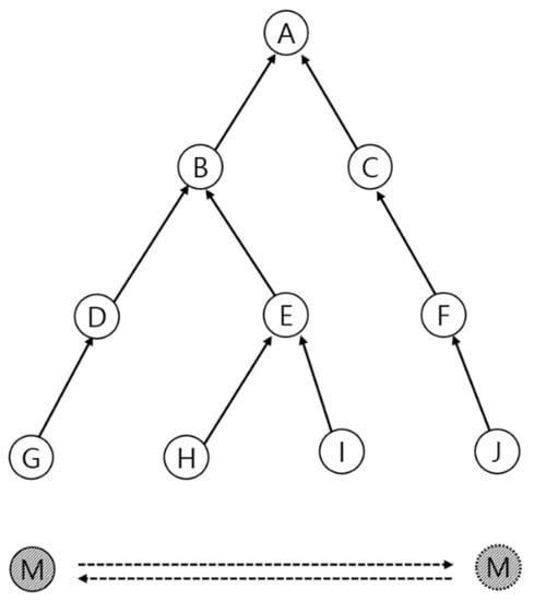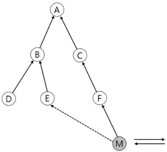 To analyze the performance of the algorithms proposed in this paper, we utilized a tree topology of up to three hop sizes consisting of ten nodes, as shown in Figure 7. In the topology, the distance per node was the same, with a distance of 5 m. A moving node moves at a constant moving speed, such that at least one node in the network is at a communicable distance, generating packets, and sending them back to the root node until they return to the starting point.