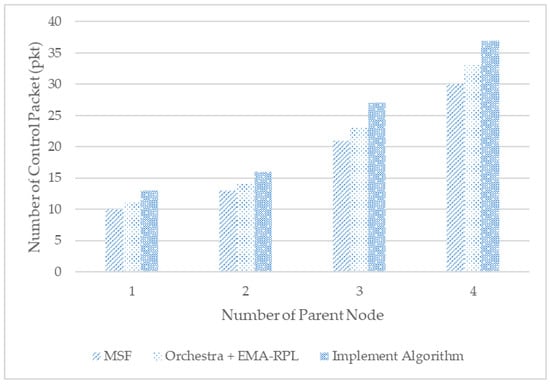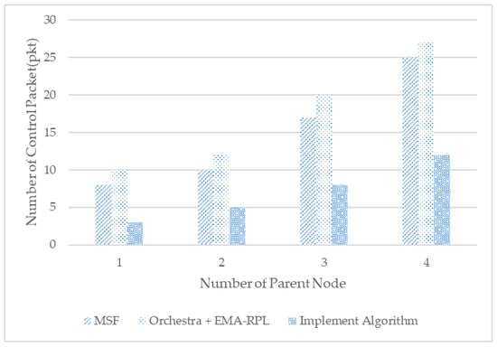 Figure 10 shows a measure of the total number of control packets used to analyze the performance of the scheduling techniques from the resource perspective of control packets. Because the number of parent nodes increased, the number of control packets increased gradually, or approximately 30% more than the MSF algorithm. This is attributed to a greater exchange of control packets per parent node to support the moving nodes.