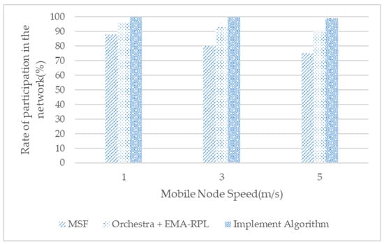 Figure 11 shows the ratio of the total time the moving node is connected to the network and communicable, with Orchestra + EMA-RPL sharing cells for RPL control messages globally; however, cell allocation for data packet communication is automatically determined through MAC hash, allowing participation in the network. However, existing MSF scheduling has a low participation rate because the speed of movement increases, as RPL control messages must compete with existing shutdown nodes through shared cells.