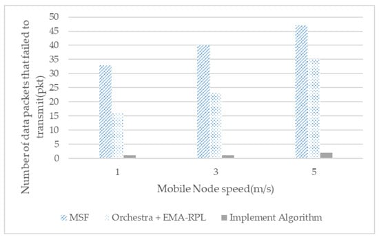 Figure 12 shows the number of packets generated by a moving node that failed to reach the root node as the moving speed increased. Although MSF and Orchestra + EMA-RPL increase rapidly depending on the speed of movement, the implementation algorithm can confirm that the number of packets that failed to transmit is exceedingly small.