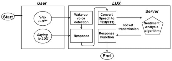 The previous section elaborated upon the implementation of the sentiment analysis algorithm for LUX. LUX consummates by the software, mirror display UI, mirror frame, and basic hardware, containing speaker and microphone module. Figure 5 describes the interaction between a user and LUX. When the user speaks, the speaker module detects, and STT API extracts voice to text. After that, the wake-up prompt and sentiment analysis proceed, as explained in Section 3. During the task, the speaker module delivers responses to the user. The socket transmission is used to connect the hardware and the server.
