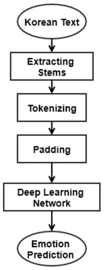 Before performing the sentiment analysis task with deep learning, several preprocessing steps such as STT and tokenizing are followed. First, the speech must be converted to text so that the NLP task will operate. The architecture of the preprocessing and machine learning modeling process is illustrated in Figure 3. It shows the procedure following the STT returning Korean text. First, the text is converted to stems, and a tokenizing process with padding is followed.